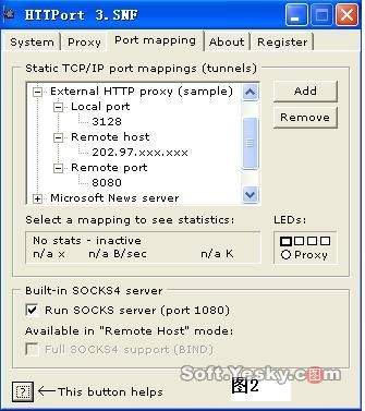 | 二、设置浏览器 在IE选项\连接\局域网设置\代理服务器地址添入127.0.0.1,端口3128(与刚才指定的local host本机端口一致)。(图 3) ![]() 图3 这里的代理就是HTTPORT的本地代理,端口是你刚才在端口映射里所设置的。HTTPORT还在本地的1080端口开了一个socks4服务。这个socks4代理很有用的,你可以配合sockscap使一些不支持代理的软件可以使用代理。 三、运行 工作流程设置完后,启动HTTPORT点proxy图中的“start”按钮,本地端口就开始工作了。你通过本机的IE浏览国外网址,IE把请求通过3128端口发给“当前代理”(本机127.0.0.1的3128),HTTPORT把3128与远方免费代理的8080做了一个映射连接,这个连接穿过了局域网上的代理服务器,你的浏览请求被发给了远方代理:8080。 在port mapping图中的LEDs项有四个指示灯(图2)。在有数据传送的时候会红/绿闪烁,每一个灯表示一个映射:第一个方形的、有着粗边框的灯对应着HTTPORT内置的socks服务器,蓝/黄闪烁表述数据传送。下面圆形的灯表示现在的代理状态,是独占的“Remote host”,绿色表示所有的请求都成功的通过了代理服务器,红色表示有一些请求没有成功并且正在重试并且持续30秒红灯的状态。 如果你的机器直接上网,你可以装一个wingate,在wingate中www proxy server属性中connection,选throught cascaded proxy server,server添入proxy.XXX.com,port填入prxoy.XXX.com的端口,结合HTTPORT的http proxy you need to bypass改为自己的地址名称或127.0.0.1,这样就使自己的机器通过两次代理,先通过proxy.XXX.com,再通过你找到的免费代理去国外网址,但代理效果不太理想。 使用HTTPORT后如果不能正常出国访问,首先应该确认免费代理是否可用。如果设置正确,打开IE后不会提示要求输入单位注册的帐号和密码。需要提醒注意的是:利用HTTPORT使用免费出国代理必须要有出局域网的帐号和密码,否则就白忙了。最后祝愿大家上网没负担,出国不花钱! |
