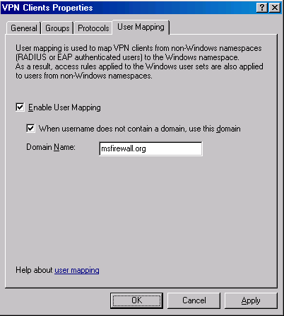 11. 点击 User Mapping 标签,勾选 Enable User Mapping 和 When username does not contain a domain, use this domain ,在Domain Name 文本框中输入 msfirewall.org ,注意这些设置将只是在使用Radius认证时使用,在使用Windows认证时这些设置将被忽略(例如ISA Server 2004防火墙属于域并且用户明确的输入域信任状)。点击 Apply 再点击 OK。你可能看见一个 Microsoft Internet Security and Acceleration Server 2004 对话框提示你为了使设置生效,你需要重启计算机。点击 OK 。