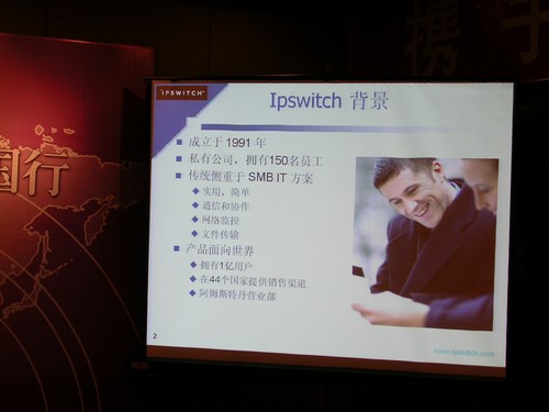 9月1日下午,在成都天府丽都喜来登饭店,美国Ipswitch公司与渠道经销商代表共同出席了“掌控无限网络资源——IPSWITCH中国行”全国巡展之成都站的活动。