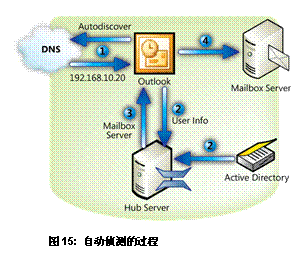 2. 客户端访问服务器上自动发现服务使用Active Directory的配置信息为Outlook创建一个配置模板。该配置模板包括Active Directory 信息和Exchange Server 2007的组织与拓扑结构信息。