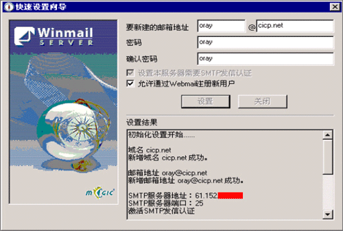 4)在安装完成后,管理员必须对系统进行一些初始化设置,系统才能正常运行。服务器在启动时如果发现还没有设置域名会自动运行快速设置向导,我们可以用它来简单快速的设置邮件服务器。这里我们建立一个oray@cicp.net的电子邮箱来为下文做示例。