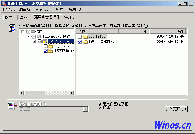 接下来运行ntbackup,开始还原。因为在同一台机器上操作,我们选择还原到原位置