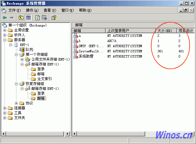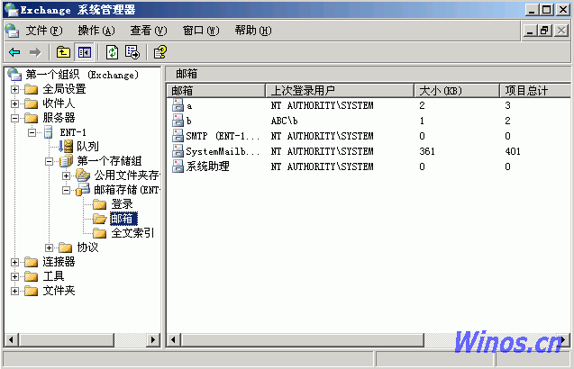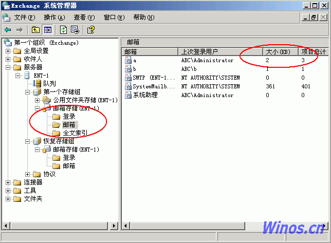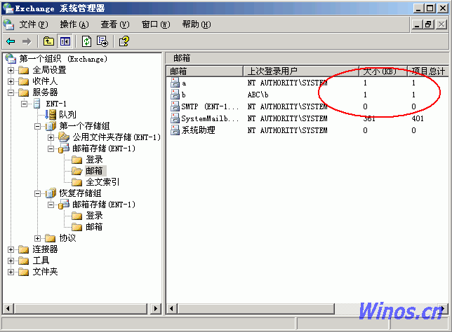 在Exchange 2003 sp2 的系统管理器中验证a和b的邮箱中项目数量: