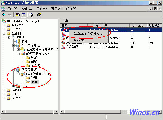 接下来我们把恢复组中的邮件合并到常规组中去,在恢复组中选择想恢复邮件的账号,比如a,右键选择Exchange任务: