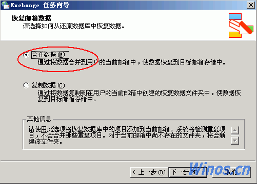 下一步,选择合并数据。合并和复制的区别在于合并不会覆盖已经存在的邮件