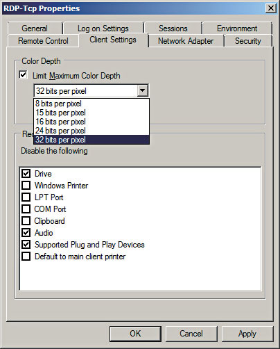 至於週邊裝置的重導向,除了舊有的磁碟、印表機之外,現在也提供即插即用裝置的重導向,因此如支援 PTP (Picture TransferProtocol) 的數位相機或使用 MTP (MediaTransfer Protocol) 的媒體播放器等。這些週邊裝置的重導向可以透過群組原則直接定義,也可以透過管理工具中的 Terminal ServicesConfiguration 的 RDP-TCP 設定的 ClientSetting 標籤來處理。(圖 1) 而且對於印表機的轉向有個新功能 - TS Easy Print,這是說我們不需要先在 Terminal Server 安裝所需對應的印表機驅動程式,就能夠讓使用者在終端機連線階段 (不管是完整的連線或只是 RemoteApp 的連線) 直接使用在用戶端電腦所設定好的印表機設定。