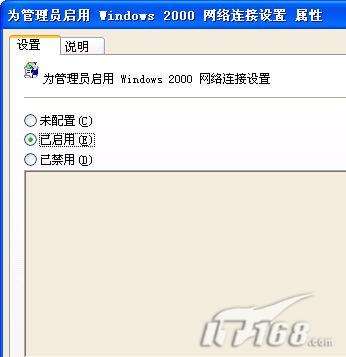 其次在该组策略编辑窗口的左侧显示区域,用鼠标展开“用户配置”策略分支,然后从该分支下面依次选中“管理模板”/“网络”/“网络连接”选项,在对应“网络连接”选项的右侧显示区域,找到“为管理员启用Windows 2000网络连接设置”选项,并用鼠标右键单击该选项,从弹出的快捷菜单中执行“属性”命令,打开如图2所示的属性设置窗口;