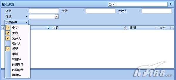 点击搜索框右侧的下拉三角按钮可打开复合搜索界面,在其中可根据全文、收发件人、时间、主题、标记、附件等参数进行多条件的符合搜索,可以以较高的精度获得搜索结果。在这个区域中默认只显示其中的几个参数输入框,我们可通过“添加条件”下拉菜单来加入其它的条件搜索。