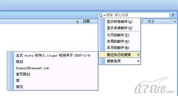 此外,Foxmail 6.5还可支持历史搜索的记录,点击输入框左侧图标旁的小三角,在弹出的下拉菜单中就记录着最近的搜索记录,且可以直接点击使用最近的搜索记录项再次进行搜索。此外,在这个弹出菜单中还有过滤邮件显示的选项。