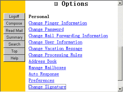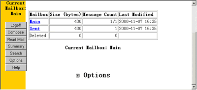 2、发送后再选“Menu”回到主屏幕,由于收件箱中已有内容,则信箱链接可以用了,如下图所示。其中的菜单和选项,Logoff退出Web方式;Compose写新邮件;Read Mail收新邮件;Summary相当于进入收件箱(Main);Mail收件箱;Sent已发送邮件箱。