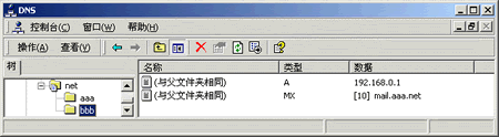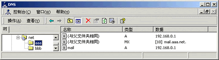 ①aaa.net的设置。在“开始→程序→管理工具→DNS”中建立如下图的记录,顺序为先建aaa.net和mail.aaa.net的A记录,再建指向mail.aaa.net的MX(邮件转发)记录。