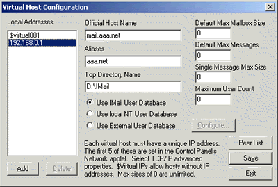 ①aaa.net的设置。进入“Imail Administrator→Add Host→192.168.0.1→ Official Host Name:mail.aaa.net→Aliases:aaa.net”。如下图所示: