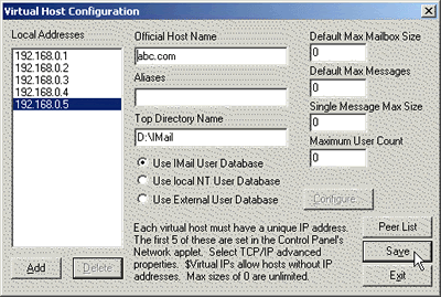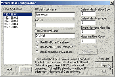 ④用同样的方法在其他IP上建立其他邮件服务器(因为IP不同,所以各邮件服务器是相对独立的,用户不会通用),全建完后,再选择save保存后用Exit退出。如下图:
