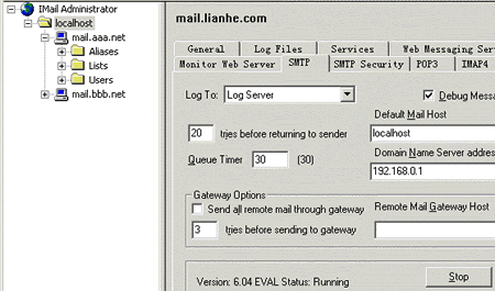 5、进入“IMail Administrator”,把“SMTP”服务“Stop”再“Start”后,修改即生效。如下图: