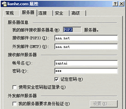 2、比如在第二个邮件服务器中建立了一个名为santai的用户,则它的E-mail地址为santai@bbb.net,它的用户名为santai@bbb.net,POP3地址为aaa.net。如下图: