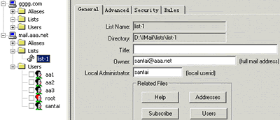 1、建立邮件列表。选“左边窗口→mail.aaa.net(邮件服务器名)→Lists→Add list...”,再输入邮件列表名。比如建立一个名为“list-1”的邮件列表,之后在“Lists”(列表)中则可看到列表名“list-1”;同时在“Aliases”(别名)中,会相应地自动建立“imailsrv”、“list-1”、“list-1-owner”及“owner-list-1”四个别名。如下图所示: