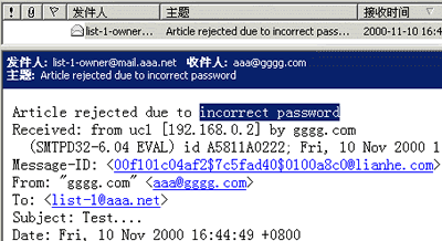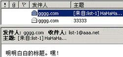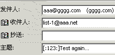 5、向列表所有者发信。“收件人”一栏填入“列表名-owner@服务器名”(如:list-1-owner@aaa.net),则将发向此列表主屏幕的“Owner”单元中所包含的E-mail中去。