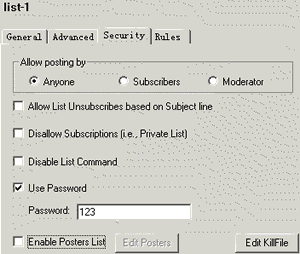 2、为了防止用户滥用邮件列表,也可以为之设置密码。只有知道密码的人才可向此邮件列表发信。