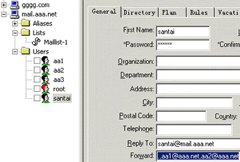 2、设置:选“左边窗口→santai(用户名)→右边窗口→General→Forward”,再输入欲转发的邮件地址。如下图选中处: