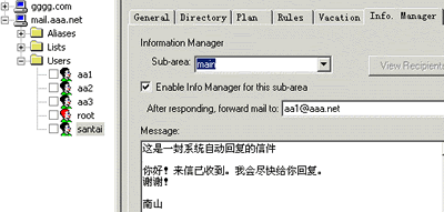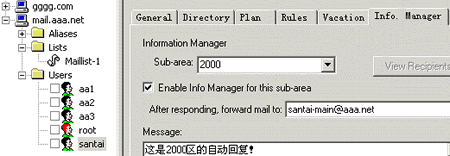 ①服务器端设置。选“Info. Manager→Sub-area→选main→Message:xxx(自动回复的信息)→Enable Info...”。如下图:
