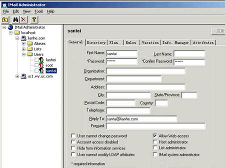 1、比如在第一个邮件服务器中建立了一个名为santai的用户,则它的E-mail地址为santai@aaa.net,它的用户名为santai,POP3地址为aaa.net。如下图: