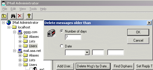 答:在主机名下选“Users”,再选“ Delete Msg's by Date...”,之后输入天数或日期。如下图: