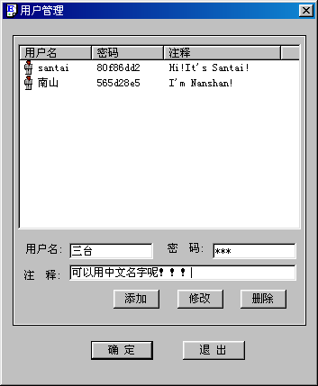 3、增加邮件新用户。选“用户管理”,输入用户信息,再选“添加”。用户名可以是中文、英文、数字、其他符号或各种字符的混合。如下图: