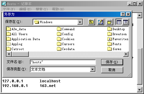 2、设置好将作为邮件服务器名的主机名(或域名)的相关的DNS记录(NT/2K)或主机名记录(98/NT/2K)。主机名记录设置可将“hosts.sam”文件输入相应内容再另存为“hosts”文件即可。如下图: