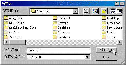 ②将hosts.sam另存为hosts(不能要扩展名!加上半角的引号则可)。如下图: