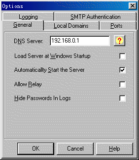 ①设置DNS服务器地址。选择“开始→程序→ArGoSoft Mail Server→MailServer”后便进入本软件的主屏幕;再选“Tools→Options→General→DNS Server:192.168.0.1(本机IP)”。如下图: