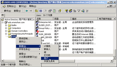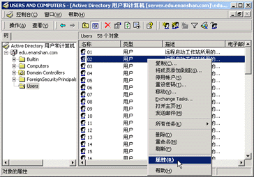 (3)在主窗口左边的"树"栏中展开"edu.enanshan.com"(此为本机的"Active Directory域名"),单击其下的"Users"(用户)项以选中它;然后在右边栏的用户列表中选中要建立电子信箱的用户,单击右键,选"属性"。此时可以看到其中跟Exchange有关的只有"Exchange Features"(Exchange的特性)一项。