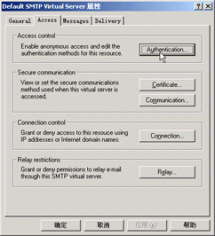(5)在SMTP虚拟服务器的属性窗口中选"Access"(存取)项,然后单击"Access Control"(存取控制)中的"Authentication"(鉴别)按钮来进行存取属性设置。