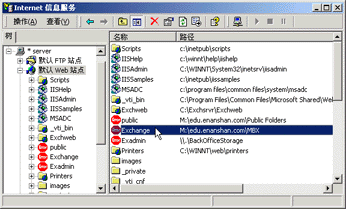 (3)欲保证每个客户端都能用浏览器访问邮件收发的Web页,需要在服务器的IIS管理器中作好相应设置。选"开始→程序→管理工具"中的"Internet服务管理器"便可进入IIS管理器中,这时可以发现系统已自动在"默认Web站点"为Exchange建立好了相关的虚拟目录。