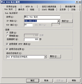 (4)在"默认Web站点"上单击右键,选"属性",再在"Web站点"项中将"IP地址"一栏选为本机的IP地址,最后按"确定"保存退出。