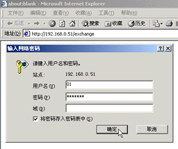 (5)现在应该是检验成果的时候了!打开IE浏览器,在地址栏输入如"http://192.168.0.51/exchange"的格式,便出现密码提示框。在"用户名"和"密码"及"域"(倘需要)处输入相应内容,再按"确定"登录。