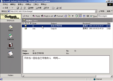 (1)Exchange Server从5.5版起就支持"Exchange Outlook Web Access"(Outlook的Web方式的存取)功能了。它允许用户通过IE(3.02版本或更高)或Netscape等支持Java及Frame(框架)的浏览器,利用和Outlook类似的Web界面来进行邮件的收发等操作。
