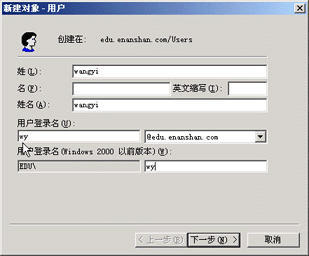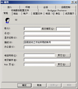 (3)在用户资料配置窗口中,"姓"和"用户登录名"(也即用户名)是必填项目;而"名"和"英文缩写"都是可要可不要;剩下的"姓名"和"用户登录名(Windows 2000以前版本)"对应空白部分系统将能够根据已填项目自动生成,可不用修改。