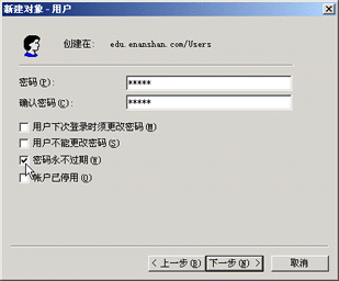 (4)接下来需按要求输入"密码"和"确认密码"选项,并确保已勾选中"密码永不过期";其他项目均建议不要选择,特别是"帐户已停用"一项如果选中,此用户就被禁止生效了!