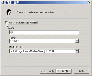 (5)在然后的提示中,如果需要此Win2K用户同时为Exchange帐号,则必须确保已勾选中"Create a Exchange Mailbox"(建立一个Exchange邮箱)一项;反之,如果只想它是普通的Win2K用户,不兼作邮件用户名,则此项就不能选中!其他项目中,"Alias"(别名)将自动被填上前面"用户登录名"中填入的内容,建议不要做改动;"Server"(服务器名)等项目也取其默认选项即可。