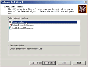(6)接着在"Availabel Tasks"(可供选择的任务)中单击"Create Mailbox"(建立邮箱)项以选中它,然后再选"下一步"即可。