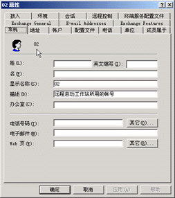(9)这时再在此用户名上单击右键,选"属性",则会看到选项中与原来的相比,又已多出了"Exchange General"(Exchange常规)和"E-mail Addresses"(E-mail地址)两项。