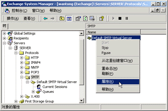 (4)对于上述的问题解决,需打开"开始→程序→Microsoft Exchange"中的"System Manager"(系统管理器)以打开Exchange的系统管理器。然后在左边的"树"栏中依次选"Servers→SERVER→SMTP"(其中,"SERVER"为服务器名),再在右边的栏目列表中选中"Default SMTP Virtual Server"(默认的SMTP虚拟服务器),在其上单击右键,选"属性"项。