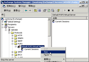 7.禁止或允许所有用户使用POP或HTTP等功能 (1)比如要禁止使用用户使用POP3功能,则先进入"Exchange System Manager"(系统管理器)中,依次选"Servers→SERVER→Protocols→POP3",再在"Default POP3 Virtual Server"上单击右键,选"Stop"即可停止此项服务。