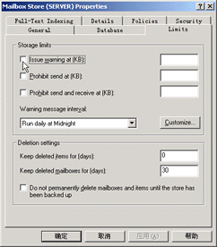 (3)在邮箱储量属性窗口的"Starage Limits"(储量限制)下?quot;Issue warning at (KB)"(发出警告)、"Prohibit send (KB)"(禁止发送邮件)和"Prohibit send and receive (KB)"(禁止发送和接收邮件)三项。