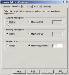 2.限制所有用户单个邮件大小 (1)仍然是在"Exchange System Manager"(系统管理器)中,选中"Global Settings"下"Message Delivery"的,然后单击右键,再选"属性"。 (2)再在"属性"窗口中选"Default"(默认设置)项,则在里面分别将"Outgoing message size"(发送邮件尽寸限制"和"Incoming message size"(接收邮件尺寸限制)下的"No limit"(无限制)改选成"Maximum (KB)"(最大值),然后在其后面的文字框中输入相应的限制值(单位为KB)即可;而"Recipient limits"(接收限制)中的"Maximum (recipients)"(最大值)则会限制接收到的邮件的最大个数(默认为5000个)。