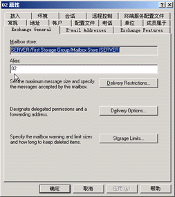 3.限制单个用户邮箱的大小 (1)在"Active Directory Users and Computers"(活动目录的用户和计算机)中,在左边的"树"栏中选中域名(比如为"edu.enanshan.com")下的"Users"项,之后在右边的窗口中就可以看到当前所有用户(包括仅Win2K的用户和同时是Win2K和Exchange的用户)。 (2)在需要作限制的用户名(比如为"02")上单击右键,?quot;属性",然后在其后的"属性"窗口中选"Exchange General"(Exchange常用)项,再按"Starage Limits"(储量限制)按钮进入容量设置的窗口。