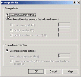 (3)在容量设置窗口中,要先在"Starage Limits"(储量限制)下去掉"Use mailbox strore deaults"(使用默认的邮箱存储设置)前的小勾,才可以设置"Issue warning at (KB)"(发出警告)、"Prohibit send (KB)"(禁止发送邮件)和"Prohibit send and receive (KB)"(禁止发送和接收邮件)三项。