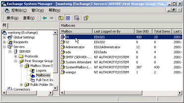 (2)然后依次在左边的"树"栏中选"Servers→SERVER→First Storage Group→Mailbox Store (SERVER) →Mailbox",则此时在右边的邮箱列表中就可以看到已建立好的各个用户及其邮箱占用情况了!