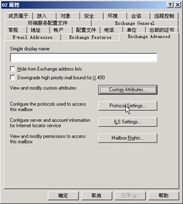 (2)再在左边的控制"树"栏中选"Users"项,在右边的详细列表中,选中欲限制的用户名,在其上单击鼠标右键,选"属性"。则此时可以看到其属性窗口中比原来多了个"Exchange Advanced"(Exchange之高级)选项,进入它,然后单击"Protocol Settings"按钮进入协议设置的窗口。