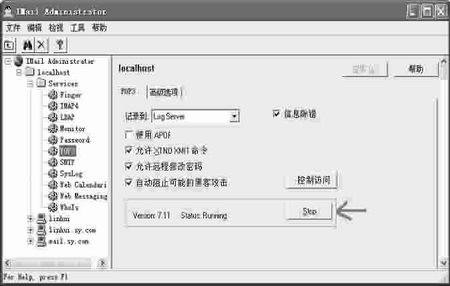 在邮件服务器上单击“开始”→“程序”→“IMail”→“IMail Addministrator”,启动管理员控制台,在控制台中展开各级联项,选择“Localhost”→“POP3”如图1),箭头所指的地方如果为“Status Running”,则表示POP3服务已经正常启动,否则点击该按扭启动POP3服务。用同样的方法可以启动SMTP服务。